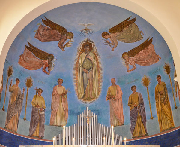 Le vetrate sono la decorazione più evidente e di maggiore impatto dell'edificio, realizzate dalla Manifattura Chini di Borgo S. Lorenzo in provincia Firenze, contano in tutto 18 grandi finestre laterali, e 2 enormi trifore in corrispondenza dei due bracci del transetto. Alcune di queste rappresentano le quattordici stazioni della Via Crucis, mentre le due trifore rappresentano: una l'Annunciazione, l'altra un disegno allegorico che vuole esprimere la rinascita attraverso il sacrificio. I pavimenti sono decorati con marmi policromi e molto interessanti risultano anche le due statue lignee che rappresentano Sant'Adolfo e San Guido.